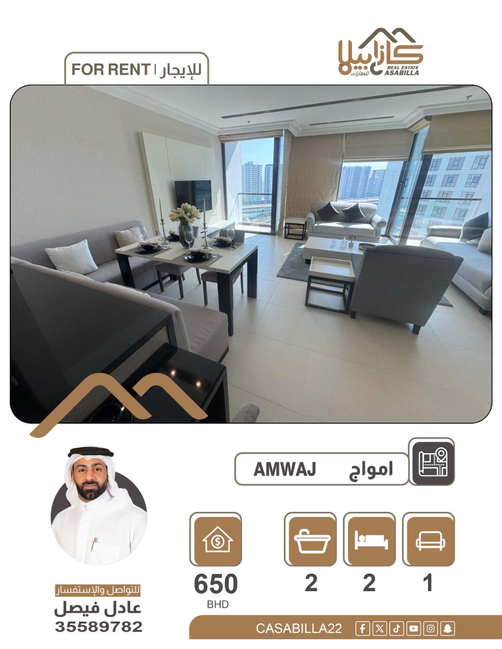 For rent: An upscale apartment in Amwaj Islands. The apartment is located in a beautiful and quiet area, close to all services. Apartment details: Two bedrooms, two bathrooms, a living room, a kitchen, and a balcony. The location is upscale and close to services. Monthly rent: 650 dinars. For contact and inquiries.