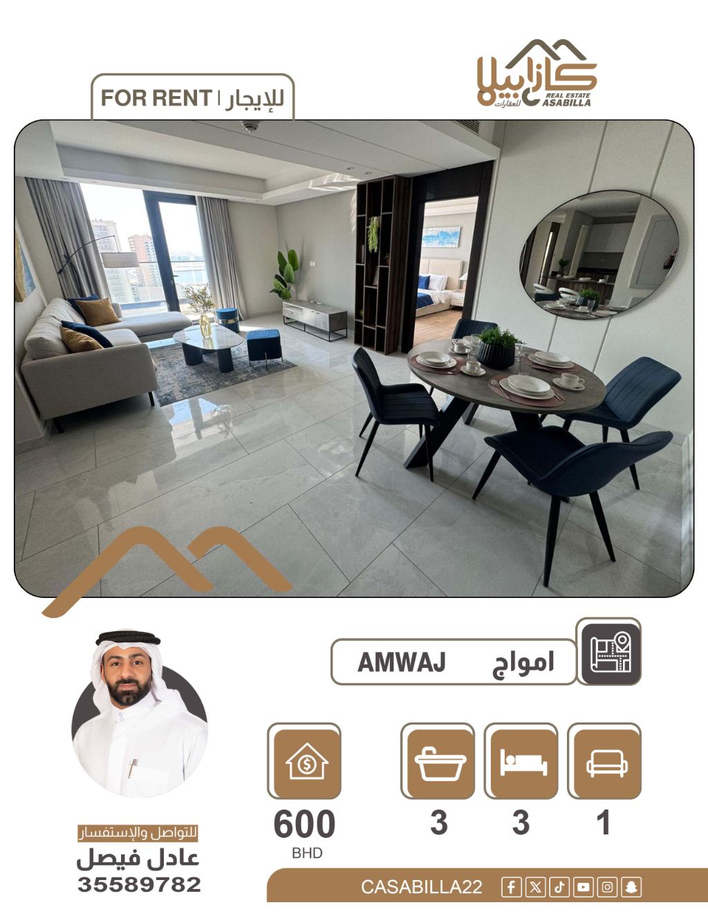 For rent: An apartment in Amwaj Islands with a sea view. A distinctive apartment for rent in Amwaj Islands with a balcony overlooking the sea, in an upscale location close to all services. Apartment details: 3 bedrooms - living room - 3 bathrooms - kitchen - balcony with a sea view. Monthly rent: 600 dinars. Electricity: 30 dinars. For contact and inquiries.