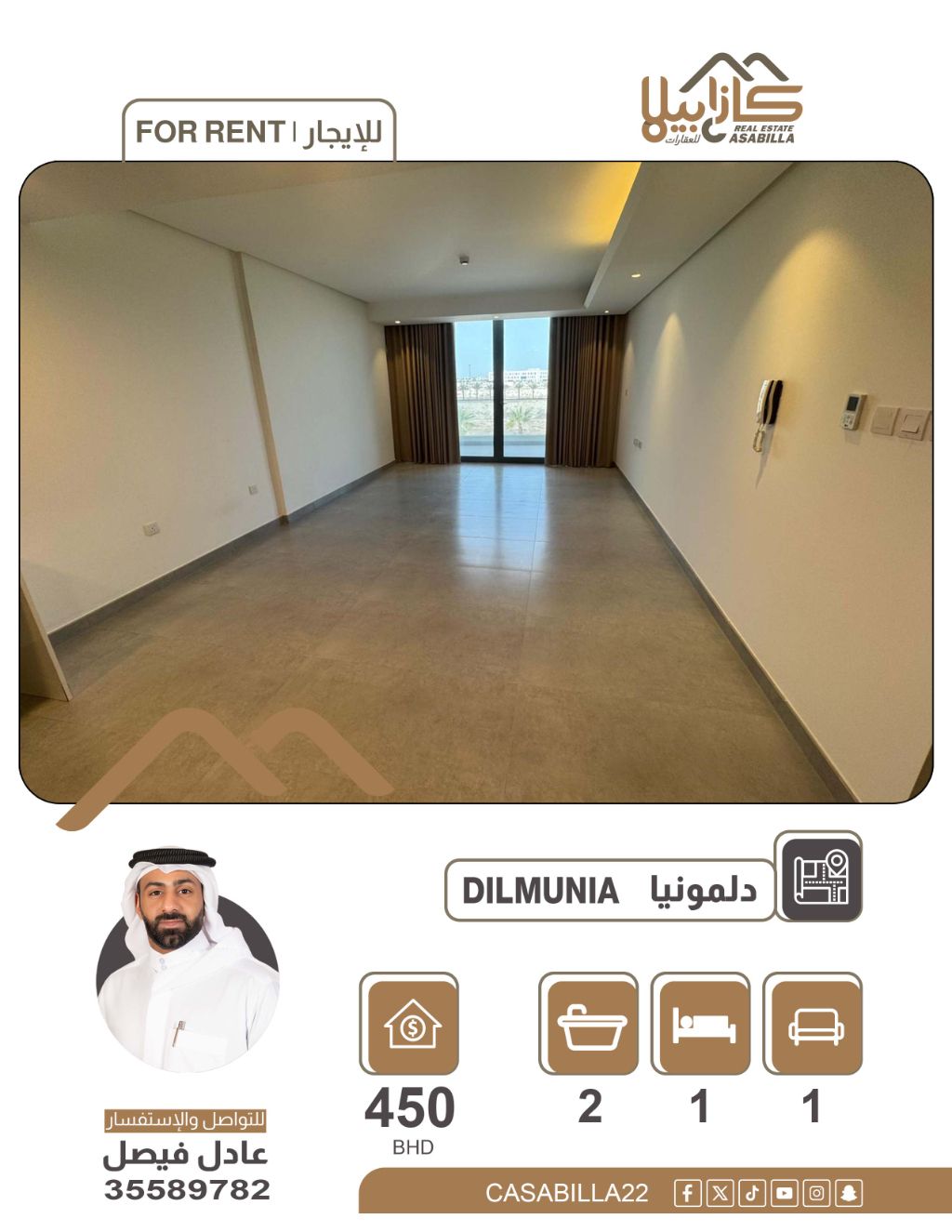For sale or rent: An apartment in Dilmunia - a modern building. A distinctive apartment in Dilmunia, located in a modern building with comprehensive facilities including a gym hall, sports hall, cinema hall, and swimming pool. Apartment details: one bedroom - hall - kitchen - two bathrooms - modern building with comprehensive facilities. Monthly rental price: 450 dinars - sale price: 63,000 dinars. For contact and inquiries.