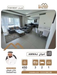 Apartment for rent in Amwaj Islands, 450 BHD. An opportunity to live in the most prestigious areas of Amwaj Islands. A fully furnished apartment in a quiet location, close to all services. Specifications: 2 bedrooms, 3 bathrooms, a spacious living room, and a fully equipped kitchen. Price: 450 Bahraini Dinars per month. For booking and inquiries.