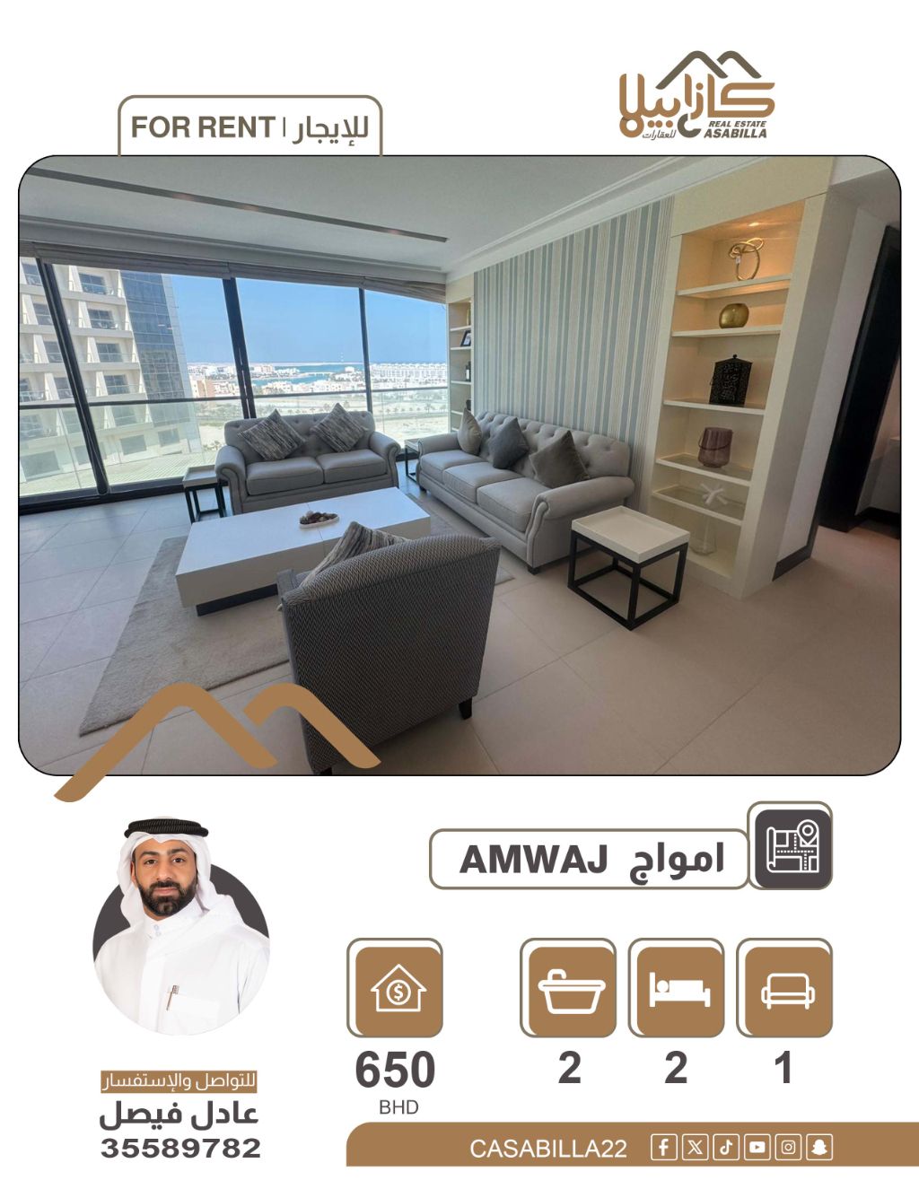 Apartment for rent in Amwaj Islands for 650 BHD. An opportunity to live in the most prestigious areas of Amwaj Islands, an apartment in a prime location close to all services to ensure your comfort. Specifications: 2 bedrooms - 2 bathrooms - spacious living room - equipped kitchen. Price: 650 Bahraini dinars per month. For booking and inquiries.