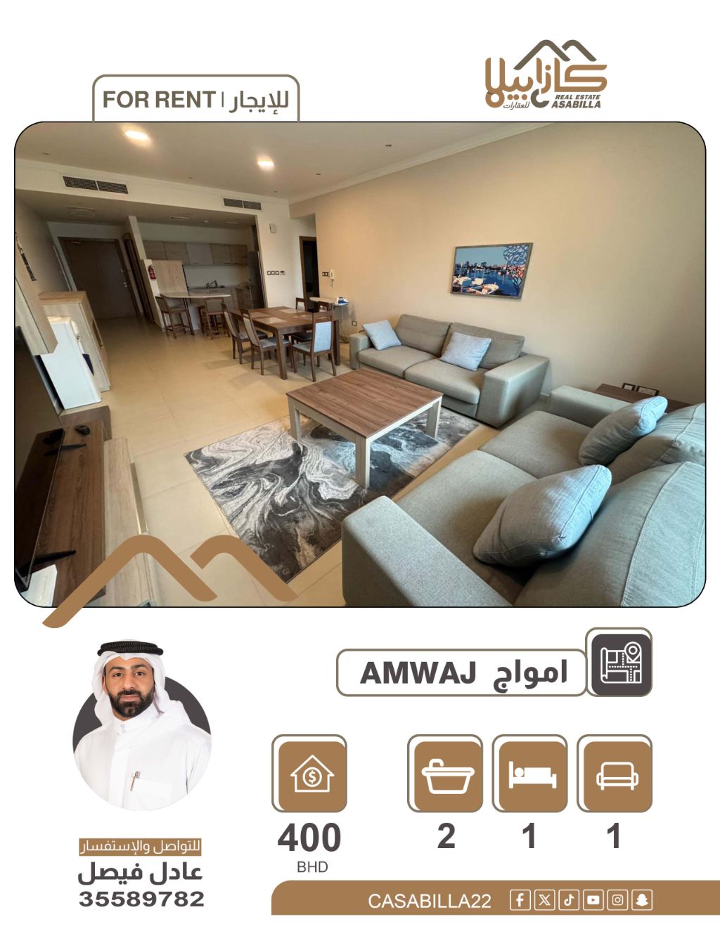 A one-bedroom apartment in Amwaj Islands with a balcony for 400 BD. An opportunity to live in the most prestigious areas of Amwaj Islands. The apartment is fully furnished in a prime location and close to all services to ensure your comfort. Specifications: 1 bedroom - spacious living room - 2 bathrooms - equipped kitchen - balcony - fully furnished. Price: 400 Bahraini Dinars per month (including electricity up to a maximum of 25 Dinars). For booking and inquiries.