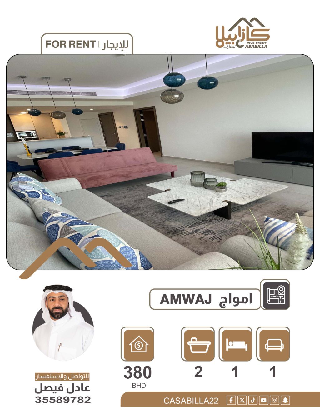 A one-bedroom apartment in Amwaj Islands with a balcony for 380 BHD. An opportunity to live in one of the most prestigious areas of Amwaj Islands, an apartment in an excellent location close to all services to ensure your comfort. Specifications: 1 bedroom - spacious living room - 2 bathrooms - equipped kitchen - balcony. Price: 380 Bahraini dinars per month (including electricity up to a maximum of 25 dinars). For booking and inquiries.