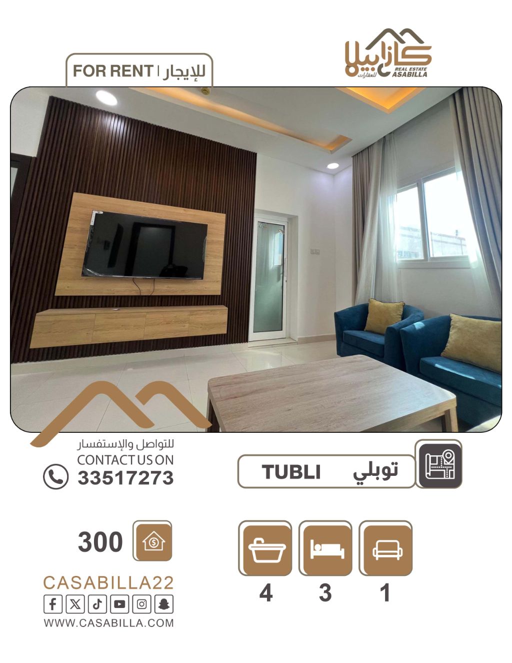A 3-bedroom master apartment in Tubli, including electricity and water for 300 BD. An opportunity for family living in a quiet and upscale neighborhood in the Tubli area (Services Street). The apartment is fully furnished in a luxurious building equipped with surveillance cameras, very close to the sea and all services. Specifications: 3 bedrooms (all master), spacious living room, 4 bathrooms, equipped kitchen, elevator, fully furnished. Price: 300 Bahraini dinars per month (including electricity and water). For booking and inquiries.