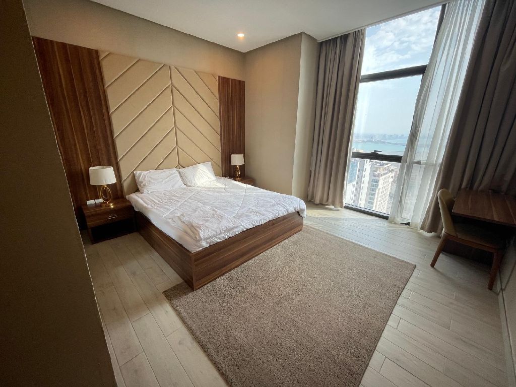 For rent, an apartment in Juffair, Maamar Tower. The apartment consists of one bedroom, two bathrooms, a kitchen, a living room, a balcony, and parking. It includes all domestic workers. The price is 320 dinars inclusive. For contact.
