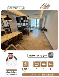 A luxurious apartment with a direct sea view in Dilmunia, featuring 3 bedrooms and hotel-like amenities. Enjoy the luxury of living in the heart of Dilmunia Island. This spacious apartment has an elegant design, a charming and direct sea view, and is located in a modern building that provides all means of comfort and entertainment. 3 bedrooms, 5 bathrooms, a spacious living room, a kitchen with a balcony, building services, a gym, a swimming pool, and a cinema hall. Monthly rent: 1050 dinars. For contact and inquiries.