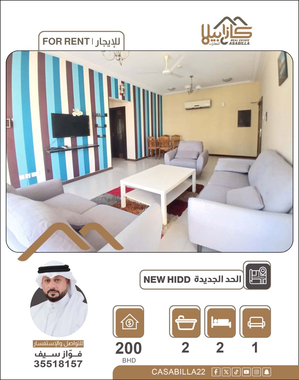 For rent: A fully furnished apartment in the New Hidd area. It consists of two bedrooms, a family living room, a kitchen, two bathrooms, and two balconies. Price: BD200 (excluding electricity). For inquiries.