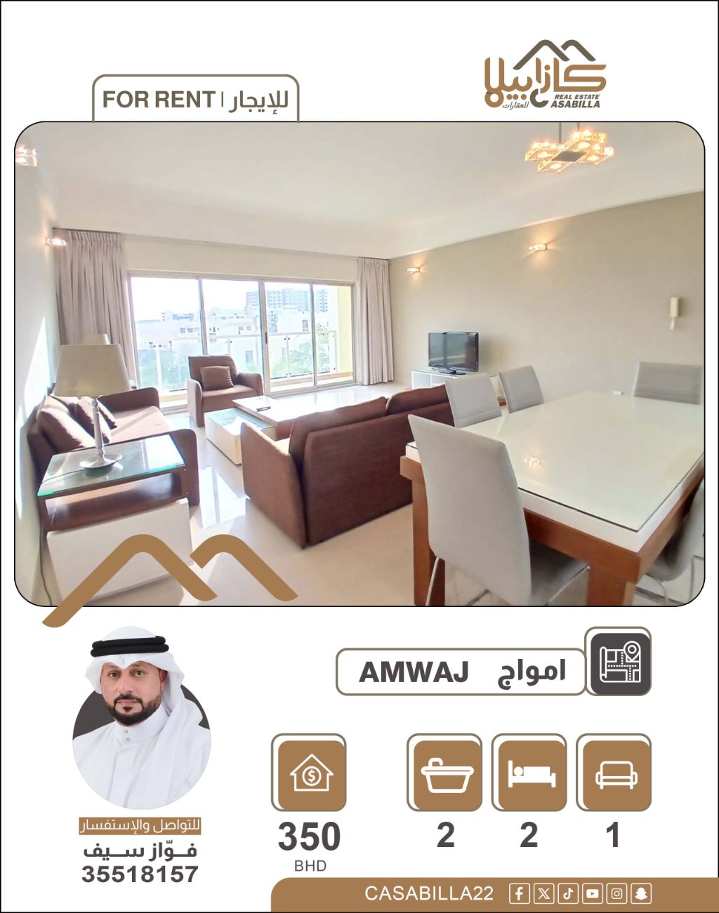 For rent: Luxurious furnished apartments in the Amwaj area, consisting of two bedrooms, a spacious family living room, a kitchen, two bathrooms, and a reception area. The price is 350 dinars, including electricity with a consumption limit of 30 dinars. For inquiries.