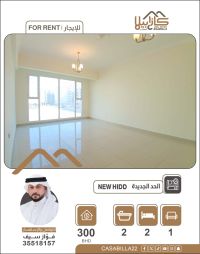 For rent: A luxurious semi-furnished apartment in the new Al-Hadd area, close to all services. It consists of two bedrooms, a spacious family living room, a kitchen, two bathrooms, a maid's room or storage room, air conditioners, curtains, kitchen cabinets, and a fully equipped kitchen. There is an elevator and parking spaces for cars. The price is 300 dinars, including electricity with a consumption limit of 30 dinars. For inquiries.