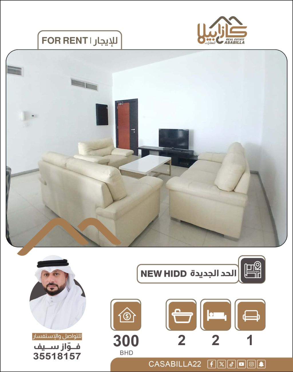 For rent: Fully furnished apartments in the New Hidd area. Each apartment consists of two bedrooms, a spacious family living room, an open kitchen, two bathrooms, and a balcony. The building features two elevators, car parking spaces, a swimming pool, and a security guard. The price is 300 Bahraini dinars, including electricity with a consumption limit of 30 dinars. For inquiries.