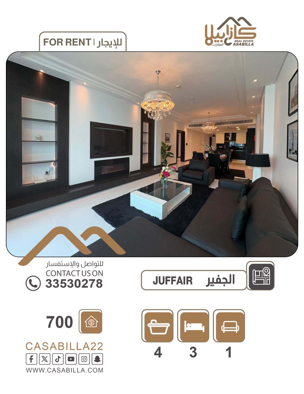 An apartment for rent in the Al Juffair area. Luxury of space and integrated design in Al Juffair. Enjoy an exceptional living experience in a spacious apartment designed precisely to meet the aspirations of large families. It features multiple facilities and includes a private laundry room, with a beautiful view from the tenth floor and a balcony that provides a wonderful escape in the heart of Al Juffair. 3 bedrooms, laundry room, living room, 4 bathrooms, balcony. Price 700 dinars, electricity limit 40 dinars. For contact.