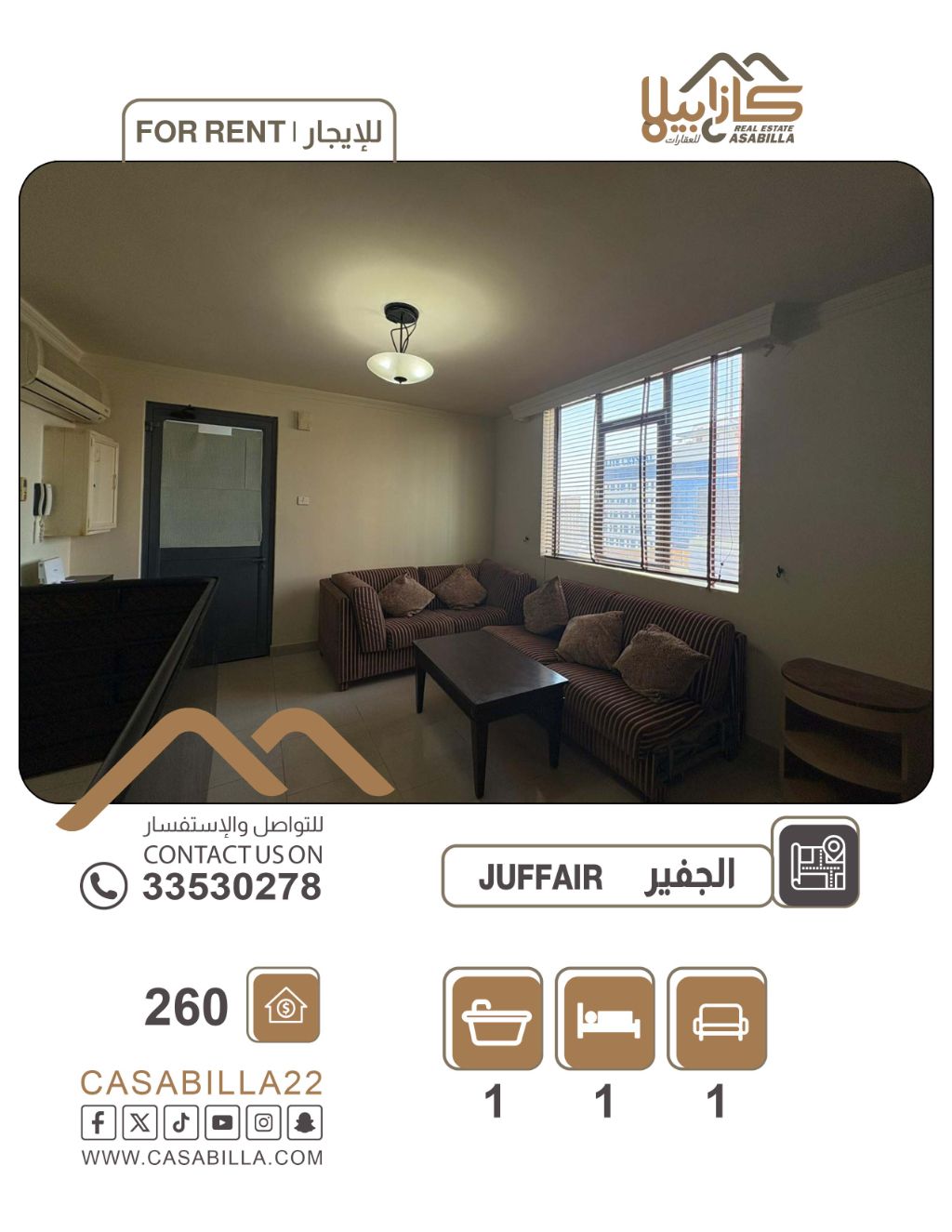 A duplex for rent in the Juffair area. The elegance of the duplex and modern living in Juffair. Enjoy a different and distinctive residential experience in an elegant'duplex'apartment on the tenth floor. A unique design provides you with privacy and comfort in a modern space, and it is the ideal choice for those seeking excellence and an economical price in the heart of Juffair. One room, living