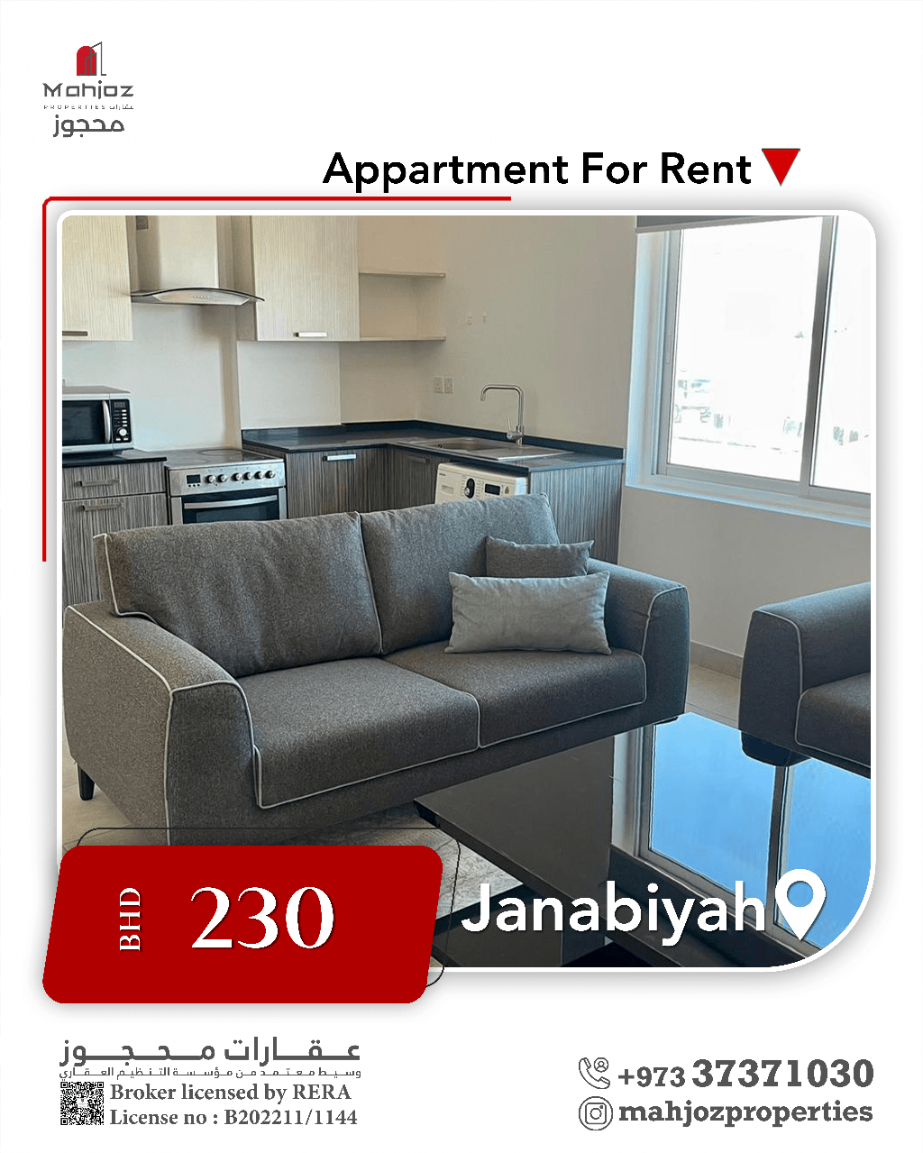 Reserved Properties offers a furnished apartment for rent in the Janabiyah area, consisting of a hall, a room, and a bathroom. The rent is 230 Bahraini dinars, including electricity and water