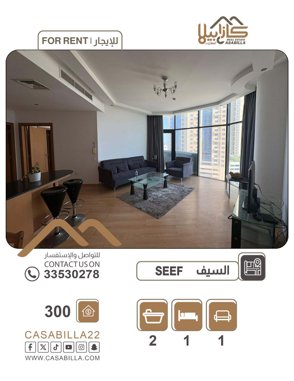 Apartment for rent in the Seef area with a high view and exceptional price in the heart of Seef. Do not miss the opportunity to live in one of the most prestigious commercial and residential areas in Bahrain. An elegant apartment on the tenth floor offers you an ideal balance between privacy and comfort, with the advantage of having two bathrooms and a private balcony to enjoy the urban atmosphere, all at a very competitive price. Living room, two bathrooms, balcony. Price: 300 dinars. Electricity limit: 25 dinars. For contact.