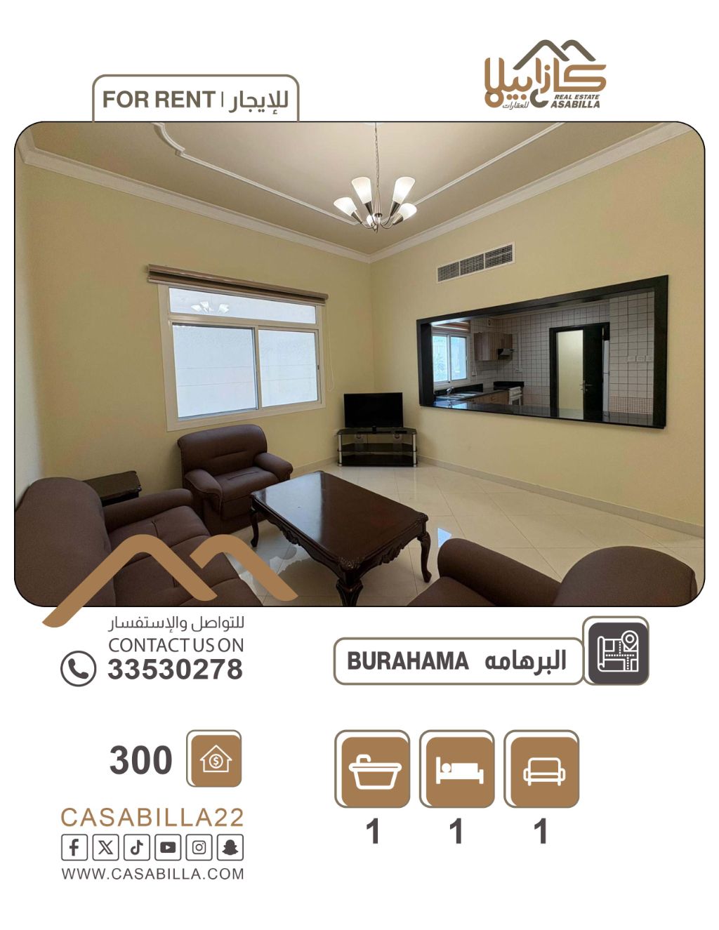 An apartment for rent in the Al-Barhama area, modern living with additional advantages. Enjoy comfort and privacy in a distinguished apartment located on the sixth floor. What distinguishes this apartment is the presence of an independent laundry room that provides better space organization, in addition to a high electricity limit that ensures a comfortable stay throughout the month in a vital and strategic location. 1 room + laundry, living room, bathroom. Price: 300 dinars. Electricity limit: 40 dinars. For contact.