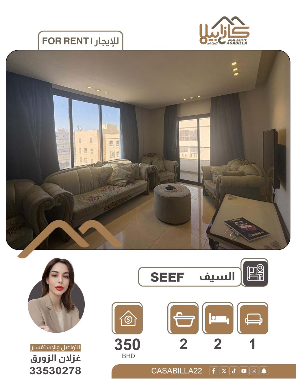 An apartment for rent in the Seef area. A modern apartment for rent in the heart of the Seef area. A distinguished apartment in Seef provides you with comfort and luxury in a strategic location with a price that includes electricity, very attractive. Two rooms, a hall, two bathrooms, a balcony. Price: 350 dinars, electricity: 25 dinars. For contact.
