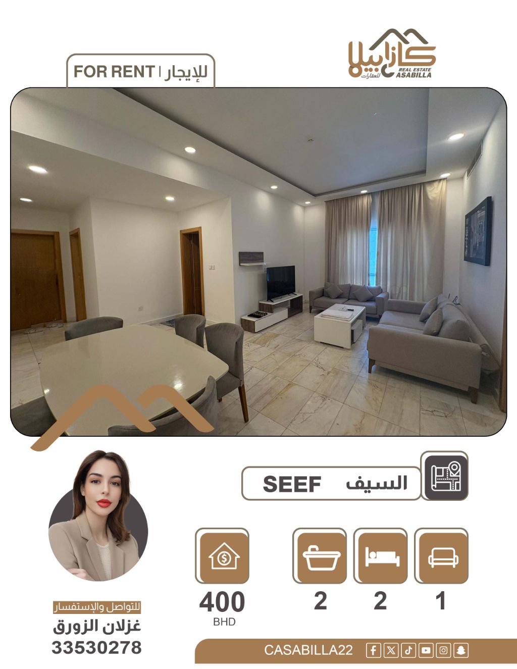 An apartment for rent in the Seef area. A modern apartment with a laundry room in Seef. A fully equipped apartment in Seef that provides comfort and privacy with excellent service facilities and a price that includes all monthly expenses. Two bedrooms + laundry room, kitchen, living room, two bathrooms. Price: 400 dinars, including electricity. For contact.