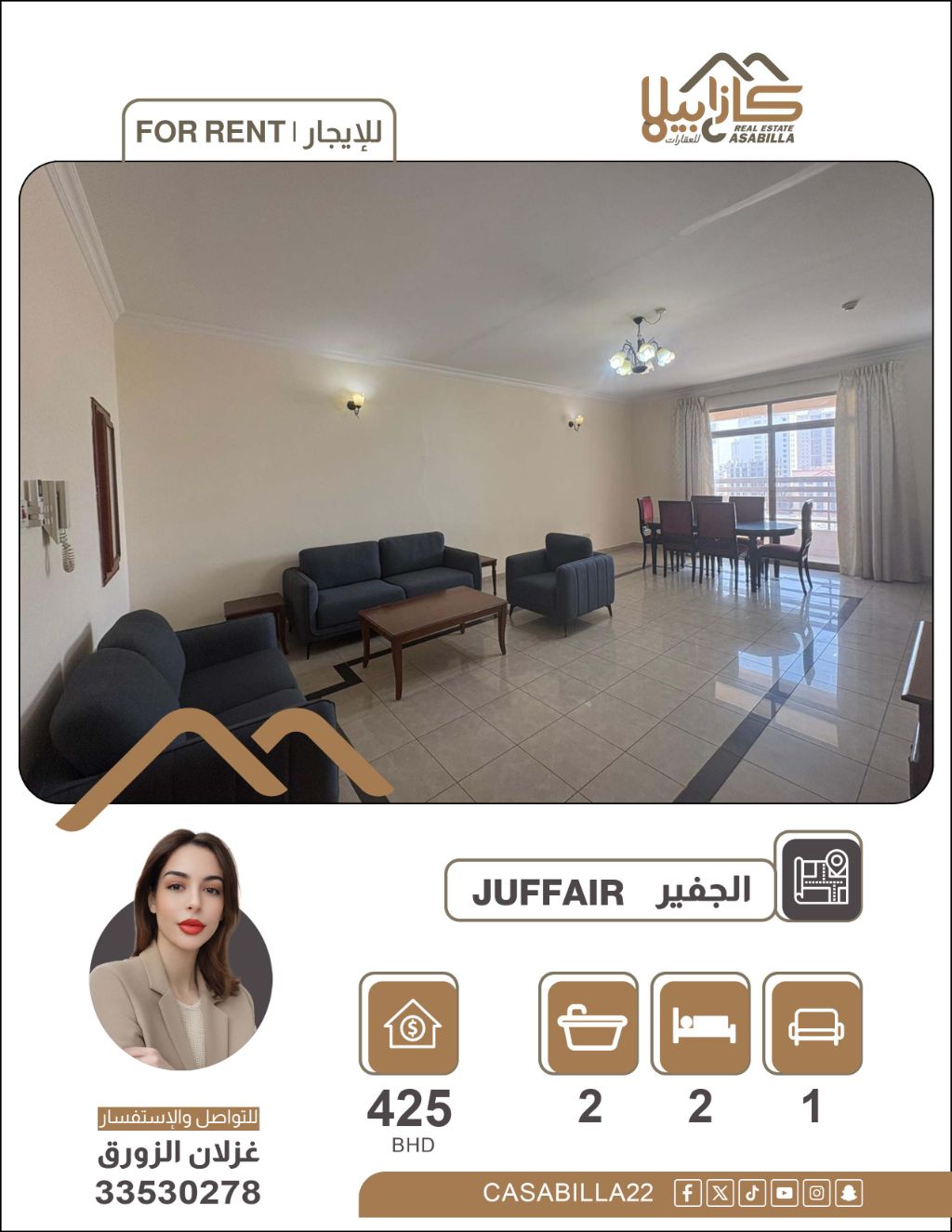 An apartment for rent in the Juffair area. Modern living and comfortable views in the heart of Juffair. Enjoy a lifestyle that combines comfort and practicality in an apartment featuring smart space distribution and a private balcony view, in one of the most vibrant areas of Manama and close to all services. Two bedrooms + kitchen storage, living room, two bathrooms, balcony. Price: 425 dinars. Electricity: 40 dinars. For contact.