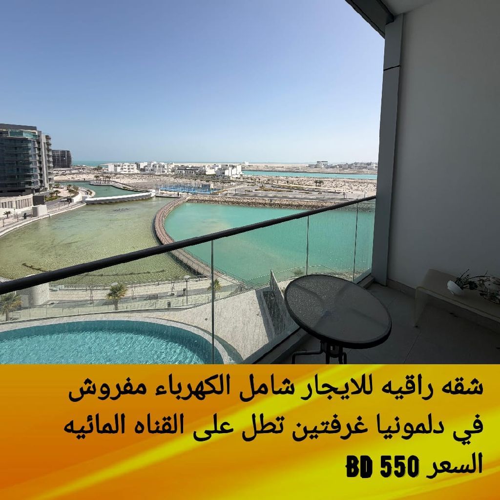 For rent: A luxurious apartment in Delmonia, Canal View Tower, overlooking the water canal. It consists of 2 bedrooms, 3 bathrooms, 1 living room, 1 kitchen, and 2 balconies. Services include 2 swimming pools (indoor and outdoor), 1 sauna, 1 steam room, 1 jacuzzi, and 1 games room. Price: 550 dinars, including electricity. Contact for more details.