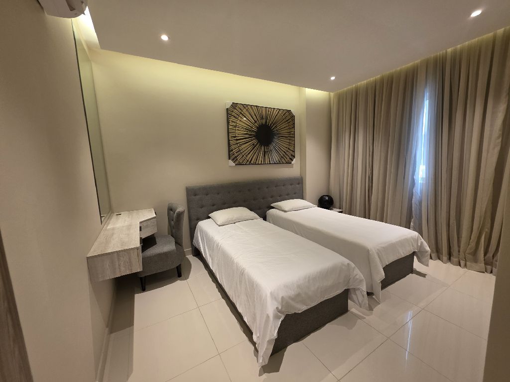 For rent: a luxurious furnished apartment in the New Limit area, consisting of 2 master bedrooms, 2 bathrooms, a lounge, a laundry room, a kitchen, an elevator, and private parking. The rental price is 360 Bahraini dinars, including electricity for 30 dinars. For inquiries, call or WhatsApp.