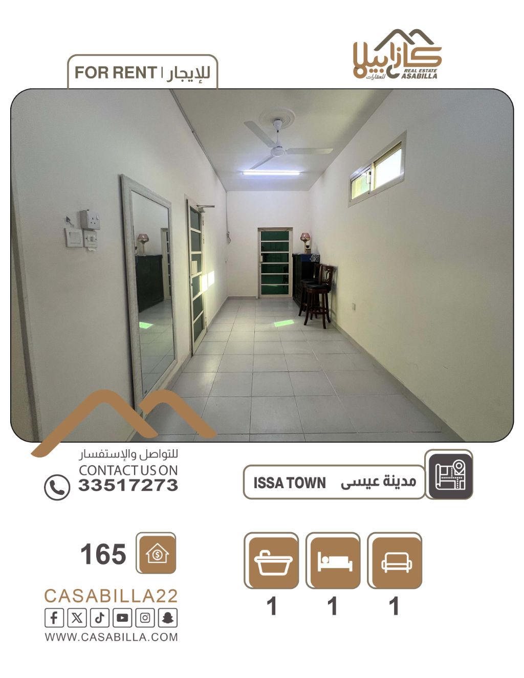 For rent: a clean apartment in Isa Town, close to Aqraa Roundabout. Fully furnished with a bedroom, bathroom, kitchen, air conditioners, oven, and living room. Near services, commercial complexes, restaurants, schools, and a mosque. Rent is 165 BHD inclusive of electricity and water. Foreign families preferred. For contact.