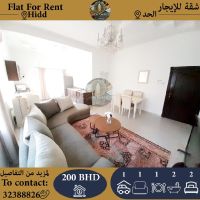 For rent: A fully furnished apartment in Al-Hidd, containing two bedrooms, two bathrooms, an open kitchen, a living room, an elevator, and a parking space. The price is 200 Bahraini dinars only. For contact: Al-Burj Al-Jadeed Real Estate.