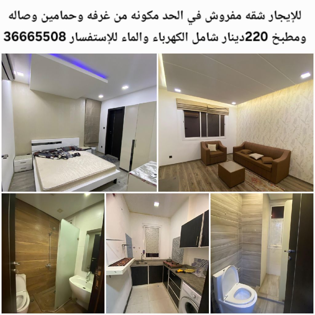 For rent, a furnished apartment in Al-Hidd consisting of one bedroom, two bathrooms, a living room, and a kitchen for 220 dinars, including electricity and water.
