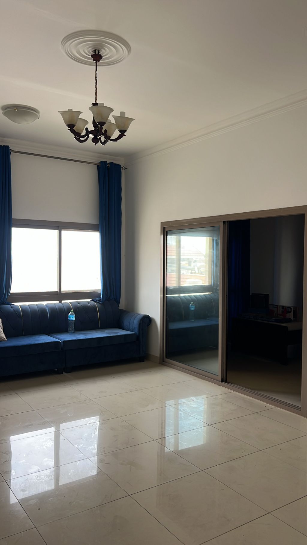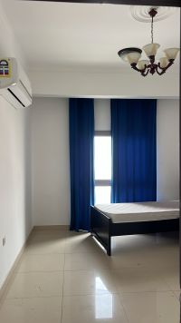 For rent: a furnished apartment with three rooms in Riffa Abu Quwara, a hall, a storage room, two bathrooms, and a kitchen on the first floor, with an elevator. Rent is 300 dinars with a deferred check.