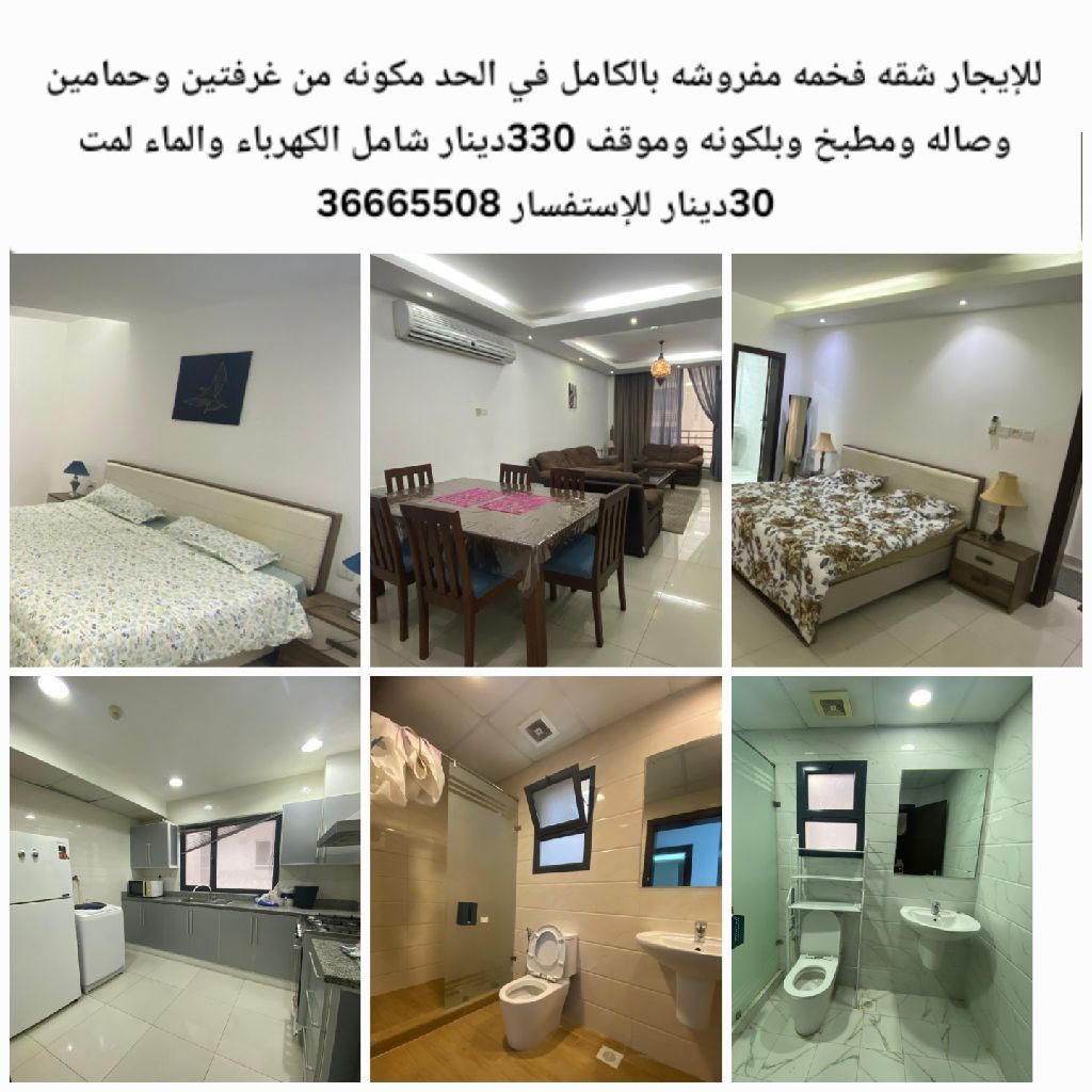For rent: a luxurious fully furnished apartment in Al-Hadd, consisting of two bedrooms, two bathrooms, a living room, a kitchen, a balcony, and a parking space. 330 dinars including electricity and water, maximum 30 dinars.