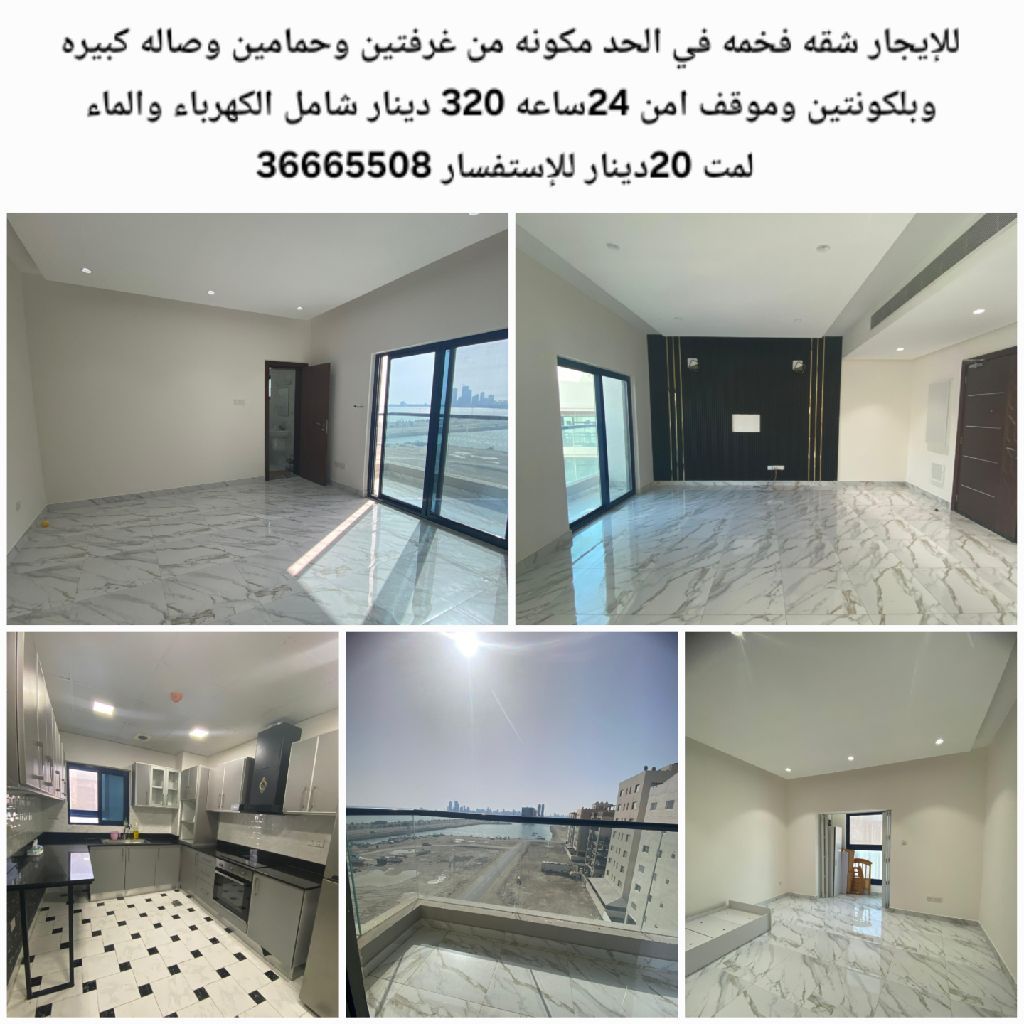 A large hall divided into two parts (a living room and a dining room), two bedrooms, two bathrooms, a fully equipped kitchen, a separate laundry room, two balconies, central air conditioning, a shaded parking spot, 24-hour security and surveillance cameras. Rent is 320 dinars final, including electricity and water, with a maximum of 20 dinars. For inquiries.