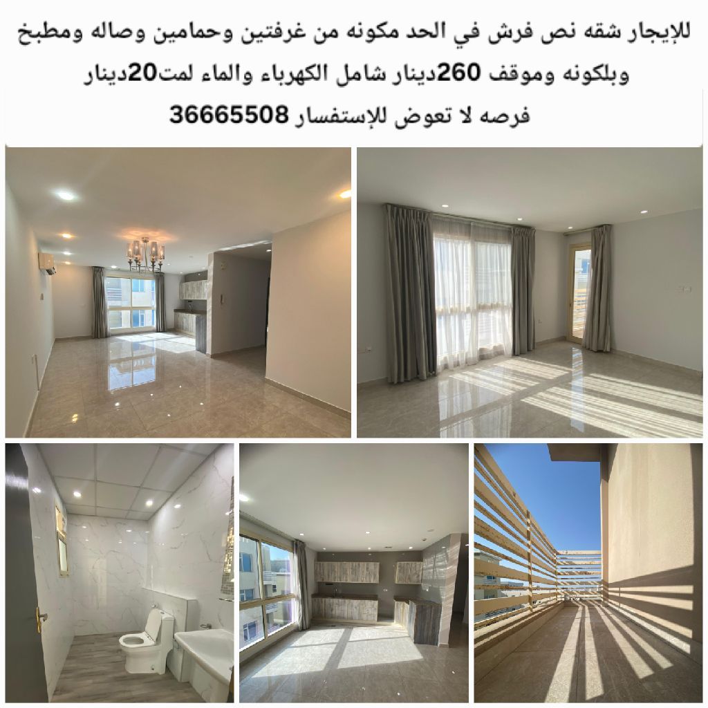 For rent: A semi-furnished apartment in Al-Hidd, consisting of two bedrooms, two bathrooms, a living room, a kitchen, a balcony, and a parking space. Price: 260 dinars, including electricity and water. Maintenance fee: 20 dinars. A rare opportunity not to be missed. For inquiries.