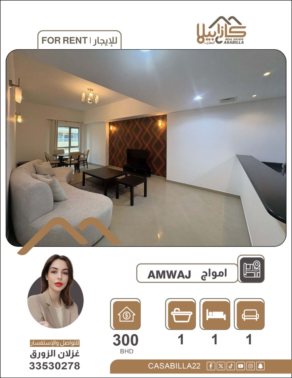 An apartment for rent in the Amwaj area, an upscale residential area with the best price in Amwaj Islands. Enjoy living in one of the most prestigious coastal destinations in Bahrain at a highly competitive price. A modern apartment with a comfortable design offers you tranquility and a beautiful view in an integrated residential environment. One bedroom, living room, two bathrooms, balcony. Price: 300 dinars, electricity: 25 dinars. For contact.