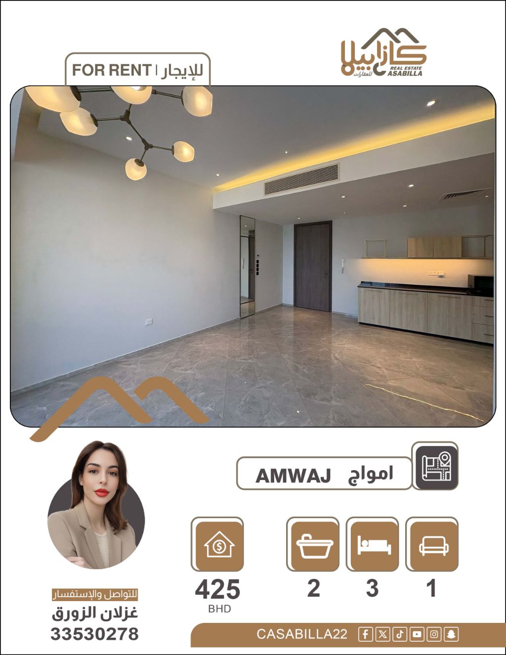 An apartment for rent in the Amwaj area, offering luxurious living in Amwaj Islands - flexible furnishing options and multiple views. Enjoy an exceptional living experience in an apartment featuring a 'Duplex Advantages' design, providing you with the privacy of two kitchens and multiple balconies, with complete flexibility in choosing the type of furniture that suits your taste. Two bedrooms, two kitchens (one open and one closed), a living room, three bathrooms, three balconies. Price: 425 dinars (semi-furnished), 575 dinars (furnished). Electricity included. For contact.