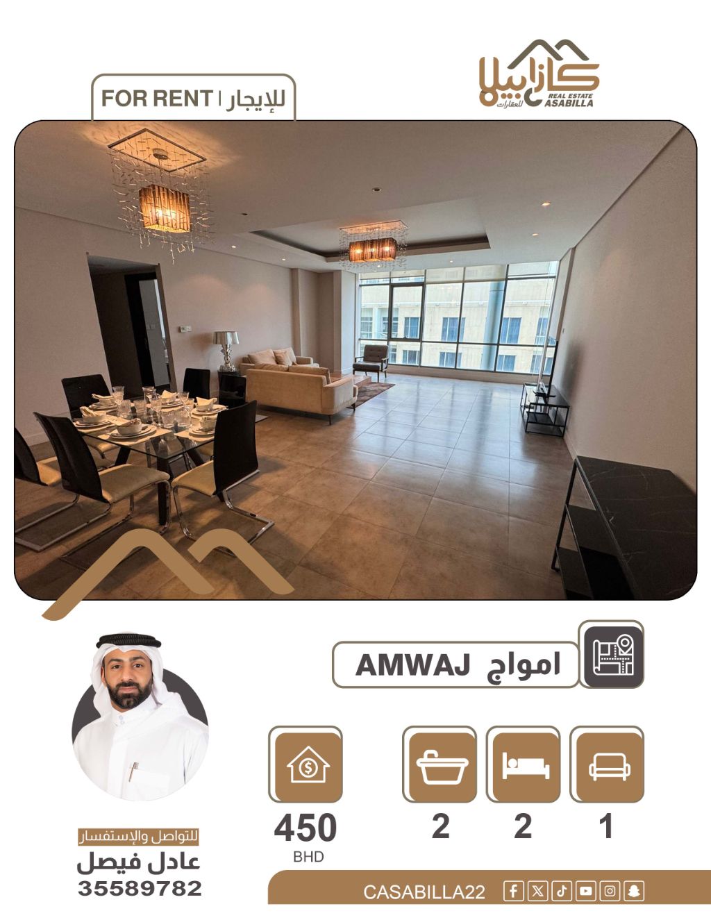 For rent: A fully furnished apartment in Amwaj Islands. Enjoy a luxurious living experience in the heart of Amwaj Islands. A complete apartment ready for immediate occupancy, featuring a modern design and elegant furniture that provides you and your family with maximum comfort in a strategic and quiet location. It consists of two bedrooms, a spacious living room, two bathrooms, and a fully furnished kitchen, ready for occupancy. Monthly rent: 450 dinars. For contact and inquiries.