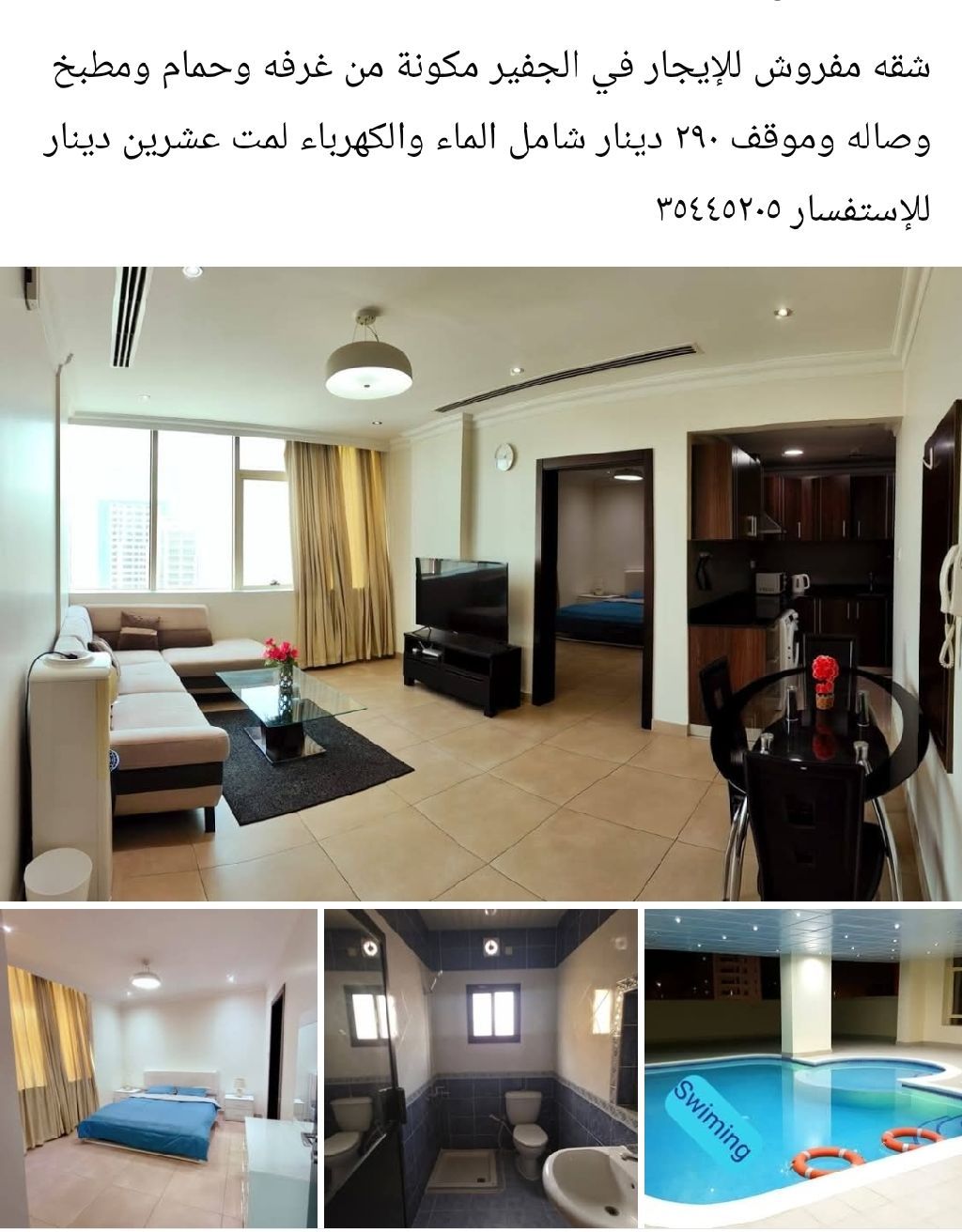 Furnished apartment for rent in Juffair, consisting of a bedroom, kitchen, bathroom, living room, and parking. 290 dinars including water and electricity. For twenty dinars.