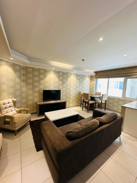 Juffair - A fully furnished apartment for rent, 1BHK, consisting of a bedroom, living room, open kitchen, bathroom, glass balcony with sea view. Services within the tower include a swimming pool, gym, jacuzzi, and children'play area. rent is 300 Bahraini dinars inclusive of electricity and internet (with a limit of 20 dinars)