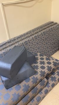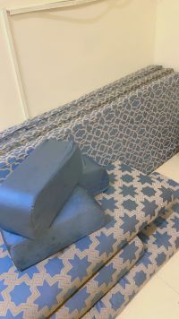 For sale: An Arabic seating set consisting of three mattresses, three backrests, and three cushions, in good condition, suitable for outdoor use. Price: 25 dinars. Contact available.