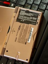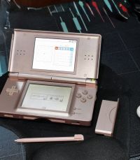 Light pink Nintendo DS Lite with battery, stylus, GBA slot, 80% clean. Price 28 Bahraini dinars only. Note transparent battery cover and a programmed cartridge with 500 listed games. Library, please