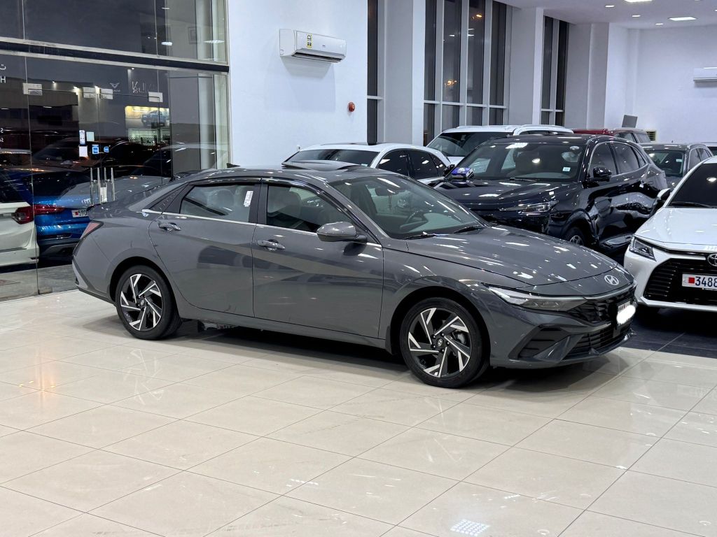 Hyundai Elantra 2024 (Gray) with 62,250 km mileage. Full options include alloy wheels, cruise control, Bluetooth, camera, sensors, push-button start, leather seats, panoramic sunroof, and more. 4-cylinder, 2.0L engine, 5 seats. Price 8,900 Bahraini Dinar (negotiable). Insurance valid until March 2026, full coverage. Under warranty. Contact for details.