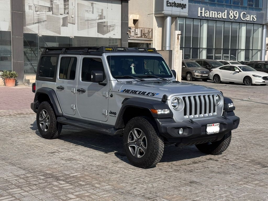 Jeep Wrangler Sport 2023 (Silver) with 38,350 km mileage. Features include: Mid Option Alloy Wheels, Bluetooth, cruise control, sensors, camera, push-button start, and more. 6-cylinder, 3.6L engine, 5 seats. Price: BD12,950 (negotiable). Insurance valid until July 2026. Contact for details.