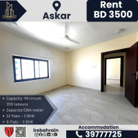 سكن للموظفين للإيجار - عسكر (بالقرب من ألبا). الإيجار: 3500 دينار بحريني شهرياً (بدون كهرباء ومياه). النوع: سكن جديد للموظفين. الموقع: عسكر - بالقرب من ألبا. الوحدات: 12 شقة - غرفتين نوم وصالة. 6 شقق - ثلاث غرف نوم وصالة. التصميم: صالة منفصلة ومطبخ مغلق في جميع الشقق. السعة: 350 عاملاً كحد أدنى (أسرة بطابقين). الكهرباء والماء: عداد كهرباء ومياه منفصل. سهولة الوصول: سهولة الوصول إلى ألبا، بابكو، راس زويد، سترة.