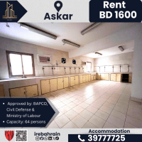 سكن عمال معتمد من شركة باب كو في عسكر - 1600 دينار بحريني. الموقع: عسكر، معتمد من باب كو، الدفاع المدني، ووزارة العمل. السعة: 64 شخصًا. الغرف: 16. الحمامات: 16. المطبخ متوفر. المستوى: مستوى عالٍ وصيانة ممتازة. الأمن: أمن على مدار الساعة. الصيانة: فريق صيانة متخصص. الصرف الصحي: تنظيف دوري منتظم. موقف سيارات: موقف مخصص للحافلات. المرافق القريبة: سوبر ماركت، مطاعم، صرافة. سهولة الوصول إلى باب كو، ألبا، سترة، الرفاع.