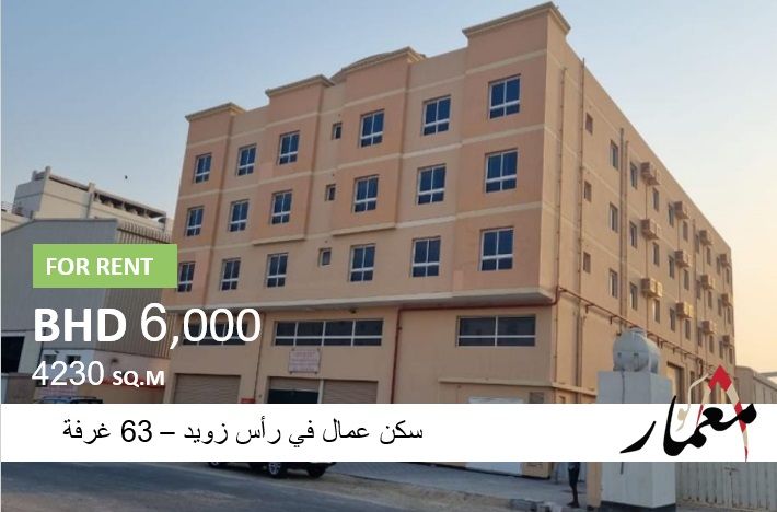 For rent A new labor accommodation in Ras Zuweid area, consisting of 3 floors, containing 63 rooms with areas ranging from 16 to 22 SQM, 36 bathrooms, 3 large kitchens, and 3 laundry rooms. The requested price is 6000 dinars