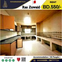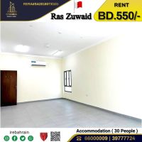 Labor accommodation (for 30 people) for rent in Ras Zuwayd, at a price of 550 Bahraini dinars. This distinguished accommodation is located in Ras Zuwayd, opposite Alba company, and includes 3 spacious rooms, a large hall, 5 bathrooms, two additional bathrooms, a large kitchen, a storage room, a laundry area, and more. All rooms and the hall are air - conditioned. A bus parking area, surveillance cameras