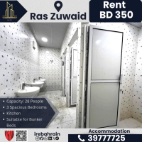 Workers' accommodation for rent in Ras Zuwayd (opposite Alba) for 350 Bahraini dinars. Capacity for 28 people. 3 spacious bedrooms, bathrooms, and a kitchen. Suitable for a family. Two floors. Located opposite Alba with easy access to Alba, Babco, Aramco, Sitra, and Riffa. Rent is 350 Bahraini dinars per month. For contact.