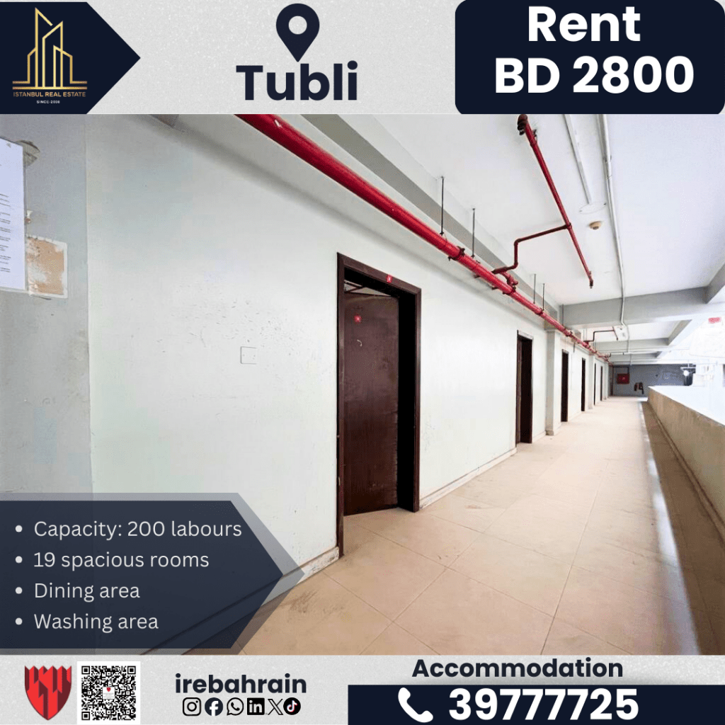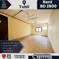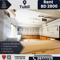 Labor accommodation for rent - Tubli 2800 Bahraini dinars. Located in Tubli, capacity suitable for 200 workers, 19 spacious rooms, bathrooms and shower areas, dining area, spacious kitchen, laundry area, unfurnished, parking available, easy access to supermarkets, exchange offices, bus stops, and hospitals. Rent is 2800 Bahraini dinars per month excluding electricity and water. For contact.