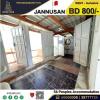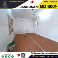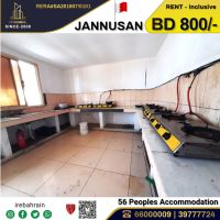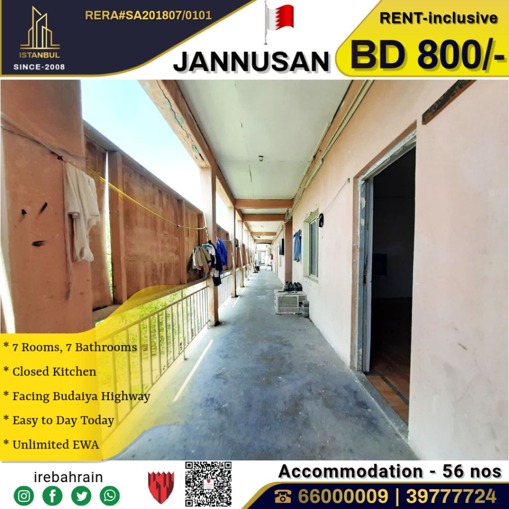 A labor accommodation (for 56 people) in Janusan, overlooking Al Budaii Road, priced at 800 Bahraini dinars including electricity and water. This labor accommodation is located in the Janusan area, near Country Mall and Day to Day Discount Center. It consists of 7 spacious bedrooms, 7 bathrooms, and one kitchen, with each room accommodating up to 8 people (using bunk beds) The accommodation is offered