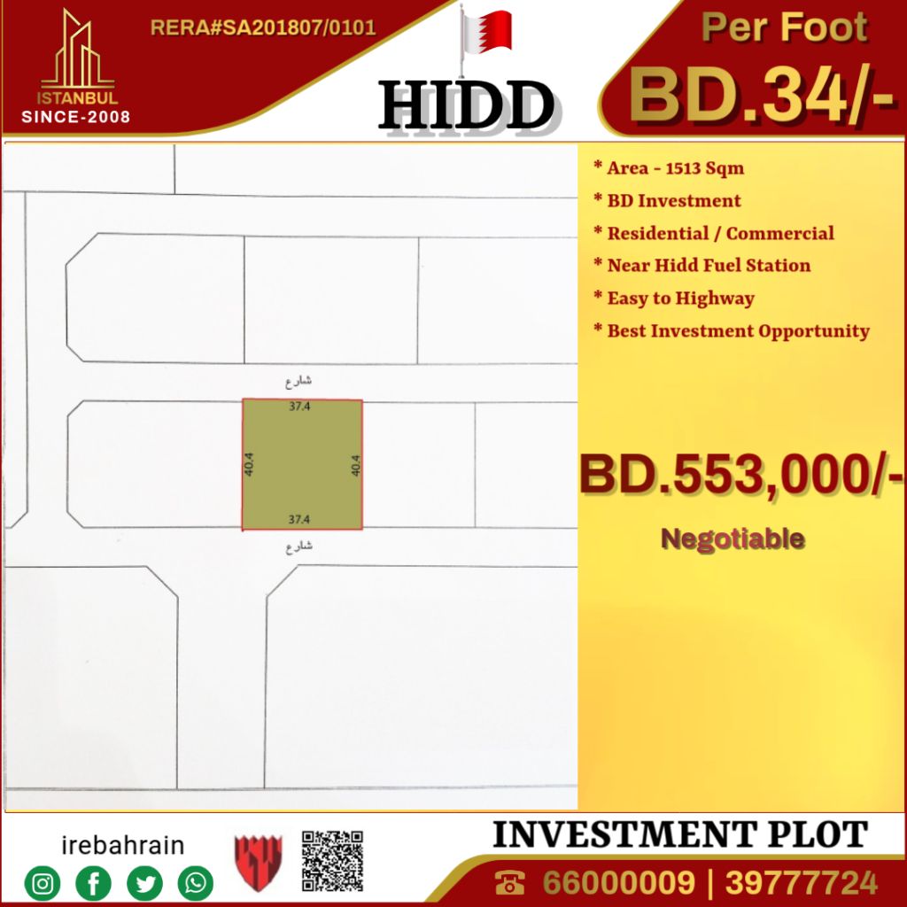 عقار استثماري للبيع في الحد بسعر 34 دينار بحريني للقدم المربع. موقع استراتيجي - مركز الأعمال الرئيسي في الحد. مساحة الأرض 1513 متر مربع. التصنيف دينار بحريني (10 طوابق - سكني / تجاري) المعالم القريبة الجانب الخلفي لستاربكس، سهولة الوصول الى ميناء بن سلمان البحري، مطار البحرين الدولي، المطار، الجفير، وسترة. 34 دينار بحريني لكل قدم مربع، الاجمالي 553000 دينار بحريني (قابل للتفاوض) عرض لفترة محدودة