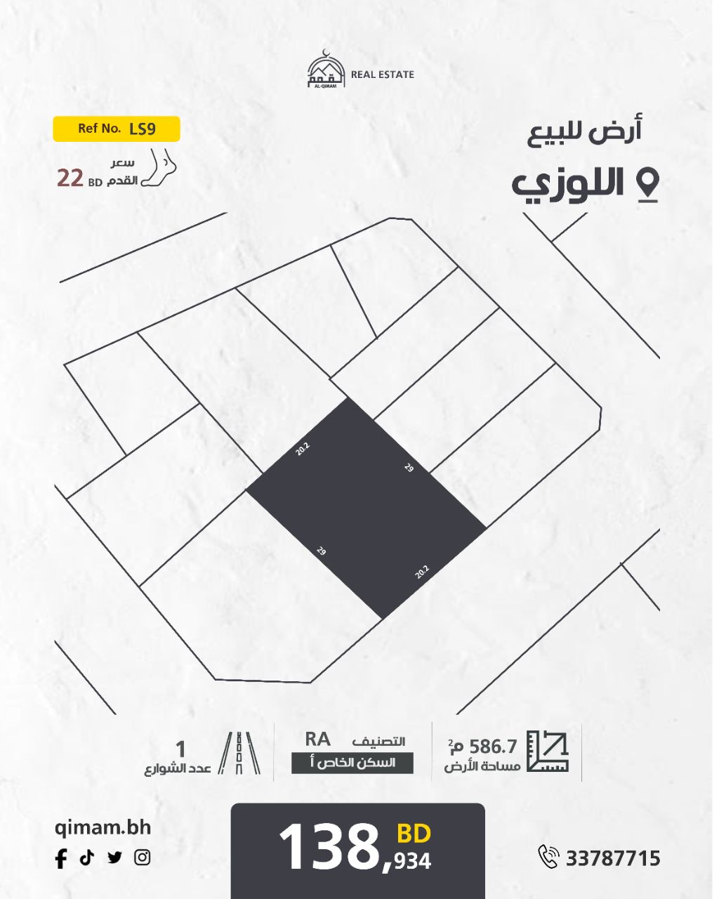 أرض للبيع في اللوزي - منطقة سكنية (RA) المساحة 586.7 متر مربع (6315.19 قدم مربع) عدد الشوارع شارع واحد. الأبعاد 20.2م* 29م. سعر القدم المربع 22 دينار بحريني. السعر الاجمالي 138934 دينار بحريني. للاستفسار والتواصل. فرصة استثمارية مميزة في منطقة سكنية راقية