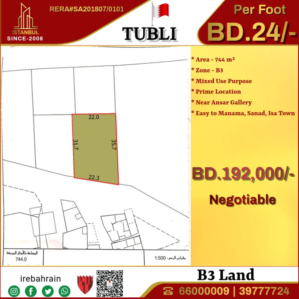 أرض للبيع في توبلي، فئة B3، بسعر 24 دينار بحريني للقدم. تقع هذه الأرض في توبلي، خلف أنصار جاليري بمساحة 744 مترا مربعا، مصنفة ضمن فئة B3، وهي مناسبة لبناء سكني أو تجاري من 3 طوابق. تتميز بسهولة الوصول الى المنامة، سلماباد، سند، مدينة عيسى، وغيرها سعر القدم 23 دينارا بحرينيا. السعر الاجمالي 192000 دينار بحريني قابل للتفاوض